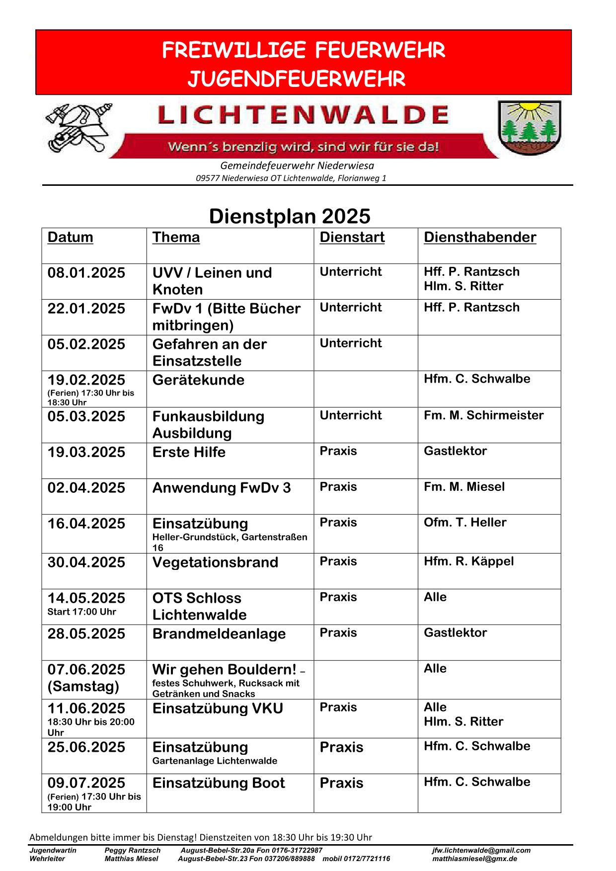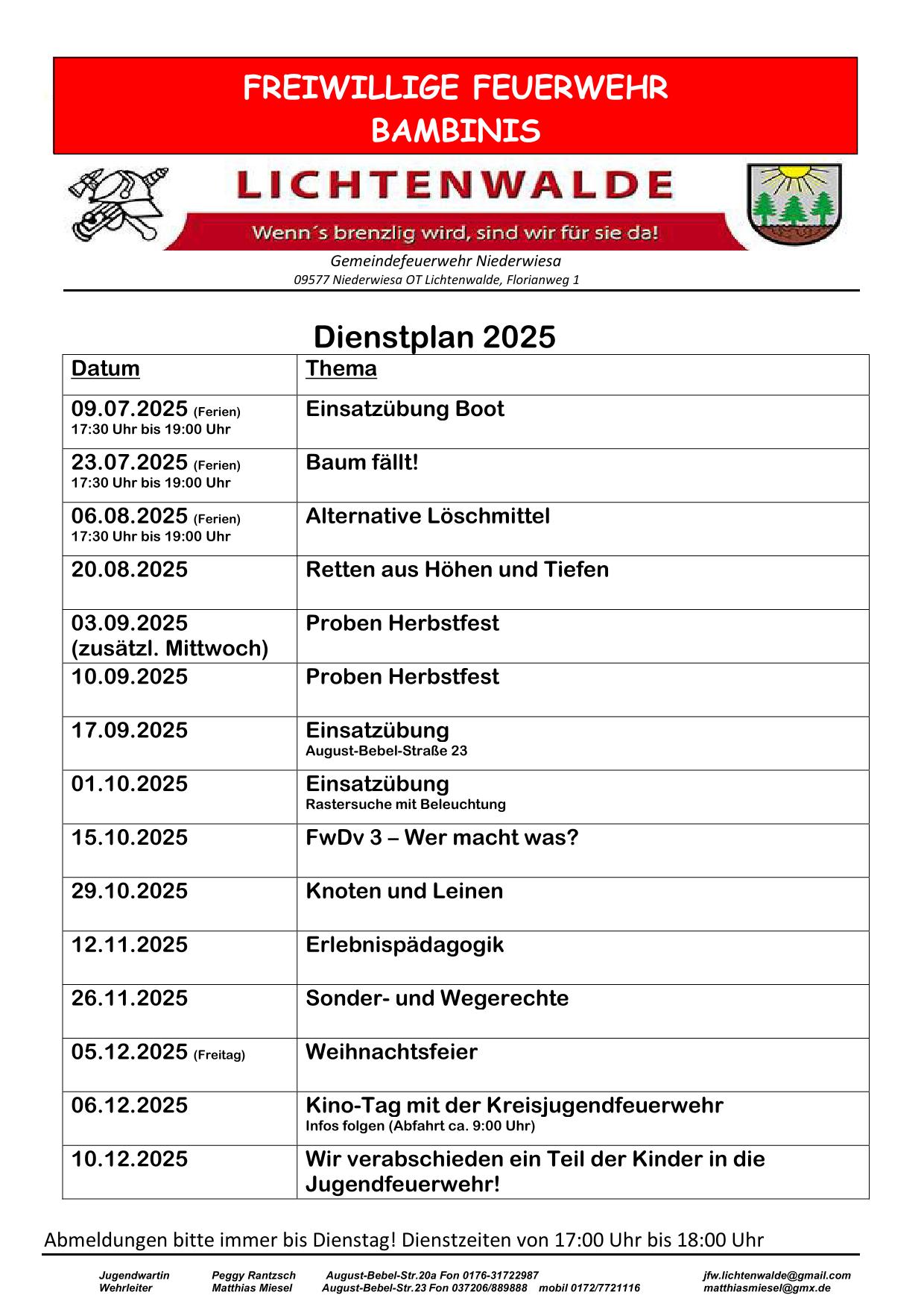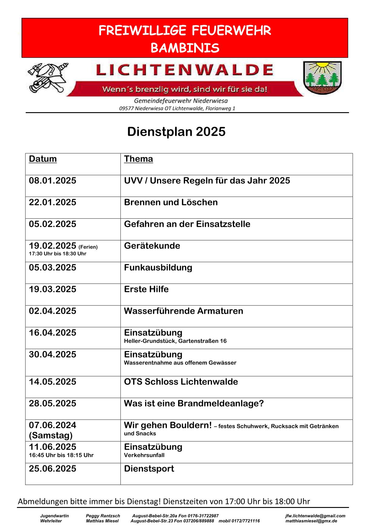 Folgend sind die Dienstpläne der Bambini-, Jugend- und Einsatzabteilung der Feuerwehr zu finden.