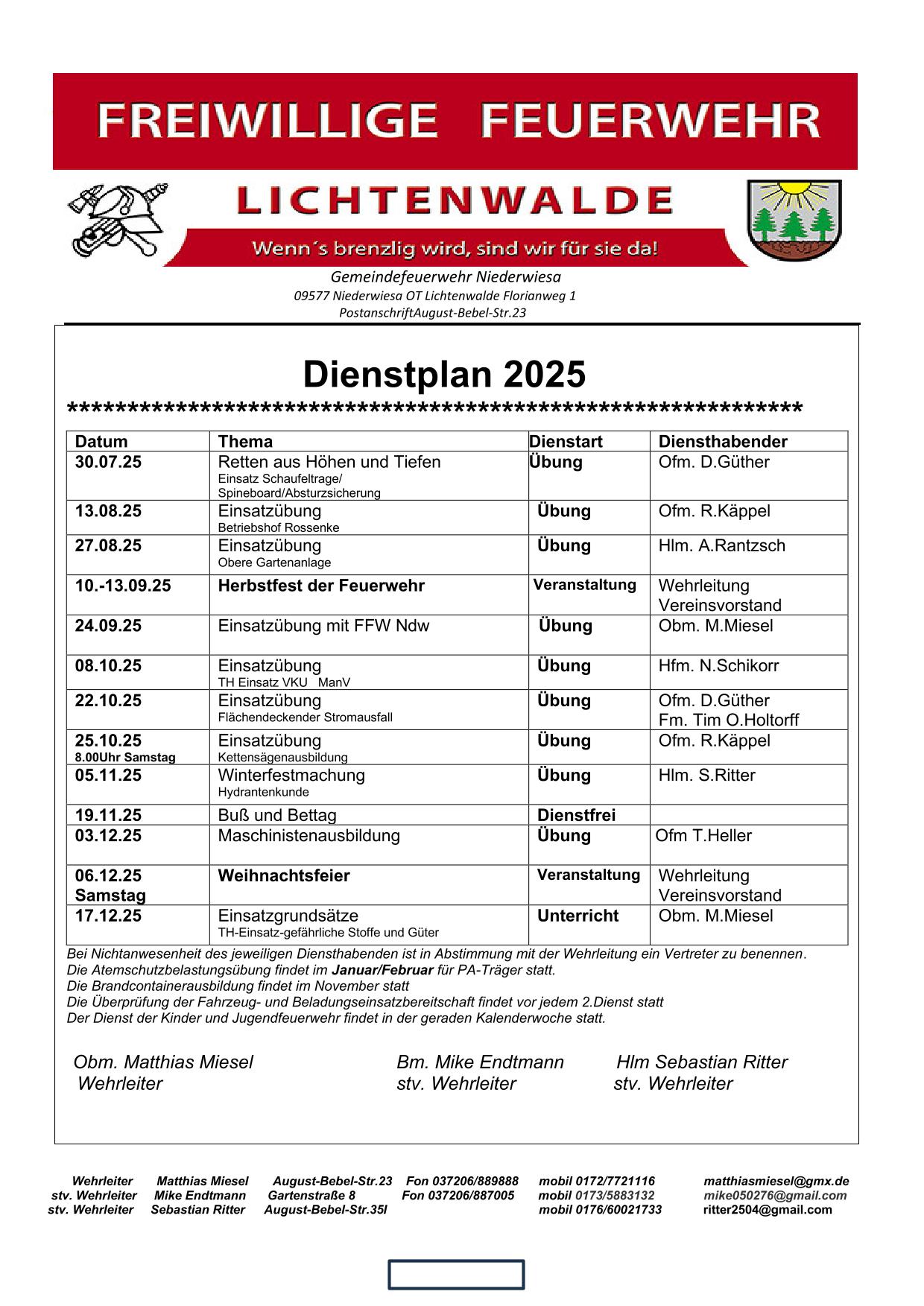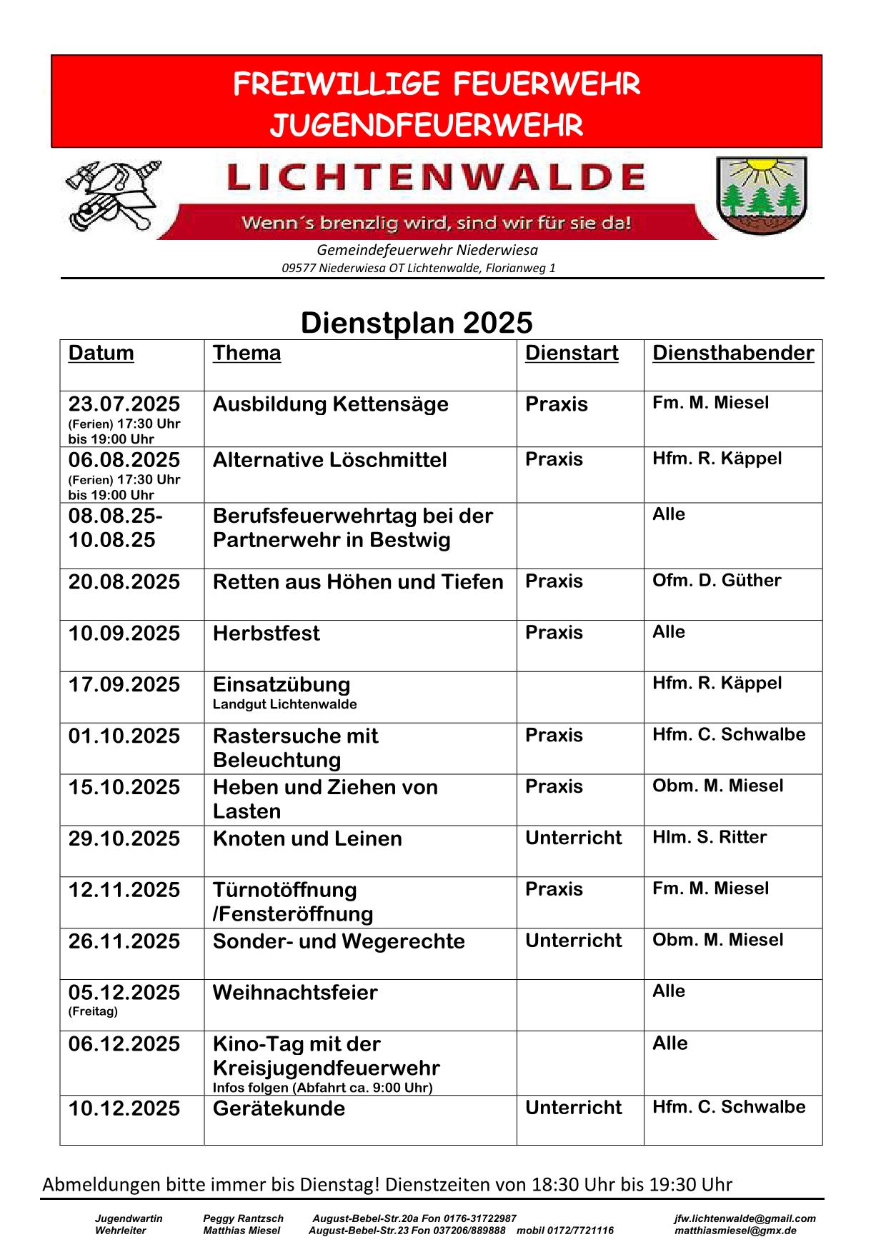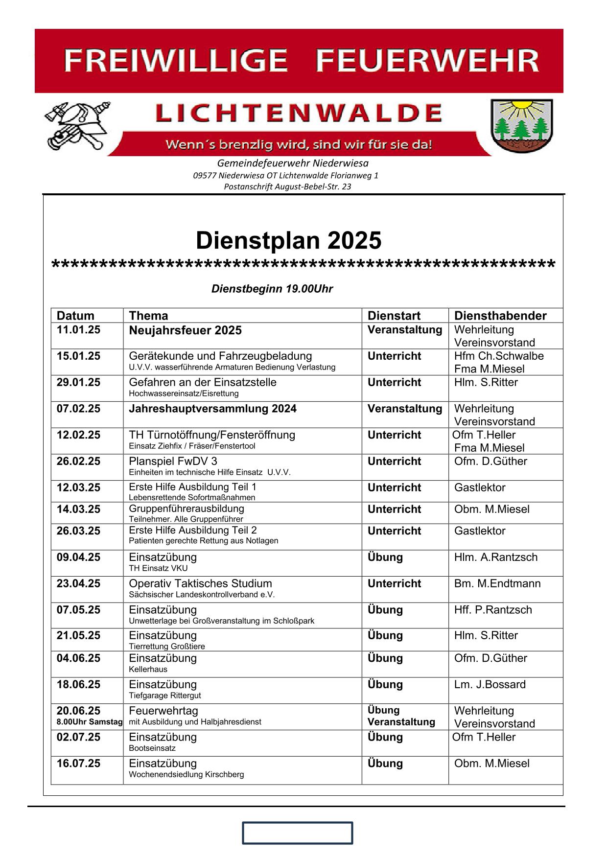 Folgend sind die Dienstpläne der Bambini-, Jugend- und Einsatzabteilung der Feuerwehr zu finden.